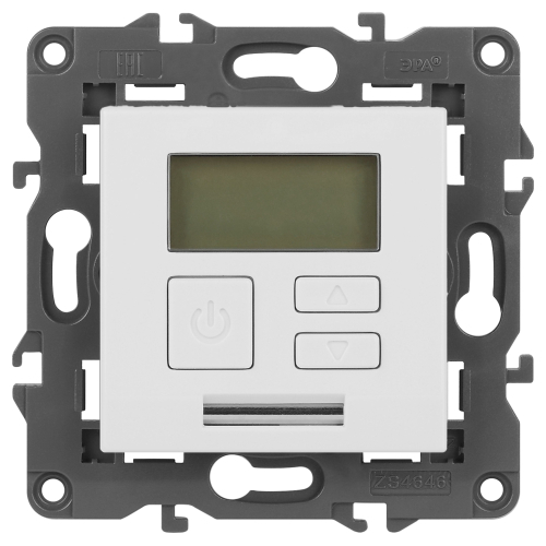 Терморегулятор теплый пол / отопление электронный серии Эра Elegance цвет белый 14-4111-01. Рамки приобретаются отдельно. Рамки Эра Elegance ПЛАСТИК: 1 пост 14-5001-хх, 2 поста 14-5002-хх, 3 поста 14-5003-хх, 4 поста 14-5004-хх, 5 постов 14-5005-хх; СТЕКЛО: 1 пост 14-5101-хх, 2 поста 14-5102-хх, 3 поста 14-5103-хх, 4 поста 14-5104-хх; МЕТАЛЛ: 1 пост 14-5201-хх, 2 поста 14-5202-хх, 3 поста 14-5203-хх, 4 поста 14-5204-хх; ДЕРЕВО: 1 пост 14-5301-хх, 2 поста 14-5302-хх, 3 поста 14-5303-хх, 4 поста 14-5304-хх (хх - код цвета: 00-прозрачный, 01-белый, белёный дуб, 02-слоновая кость, 03-алюминий, 04-шампань, 05-чёрный, чёрное дерево, 07-ясень, 09-дуб, 10-венге, 11-клён, 14-медь, 21-жёлтый, 22-оранжевый, 23-красный, 25-бордо, 26-лайм, 27-зелёный, 28-голубой, 29-синий, 30-розовый, 31-мокко, 32-серый, 41-сталь, 42-титан).