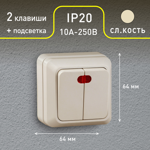 Выключатель 2-клавишный с подсветкой серии Intro Quadro открытой установки цвет сл.кость2-105-02. Номинальные характеристики 10А 250В. Выключатель выполнен из качественного термопласта, стали и латуни, оснащён винтовыми зажимами.