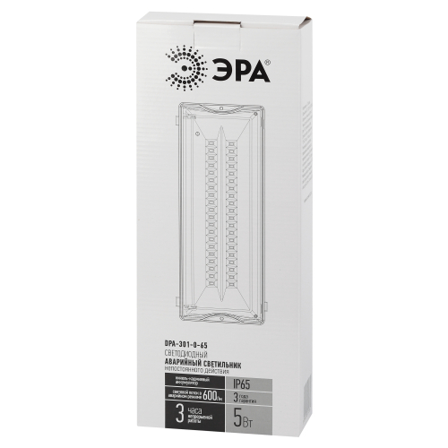 Светильник аварийный светодиодный. Область применения: Предназначен для освещения путей эвакуации, коридоров, проходов, запасных дверей; как эвакуационные или указательные светильники (при наличии пиктограмм).; время автономной работы 180 минут; наличие кнопки "ТЕСТ" для проверки работы в аварийном режиме. Гарантия:3 года.Диапазон рабочих температур:(+1+35). Класс энергоэффективности:A. Климатическое исполнение:УХЛ4. Преимущества: время автономной работы 180 минут; наличие кнопки "ТЕСТ" для проверки работы в аварийном режиме.Цветовая температура:6500K. Материал корпуса:пластик. Габариты: 355x136x58мм. Потребляемая мощность:5Вт. Степень защиты от окружающей среды:IP65. Тип рассеивателя: прозрачный. Тип кривой: Д.
