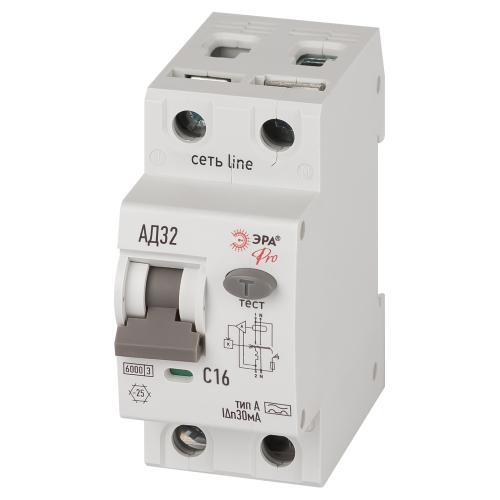 Автоматический выключатель дифференциального тока 6кА ЭРА АД-32 линейки Pro. АВДТ электронного типа. Профессиональные АВДТ ЭРА защищают человека от поражения электрическим током при повреждении изоляции электроустановок, предотвращают пожары вследствие токов утечки, предохраняют от перегрузки и короткого замыкания. Рекомендуются для защиты групповых линий, питающих розетки наружной установки, розеток и освещения подвалов и гаражей. Современное решение для квартирных щитков и промышленного применения.