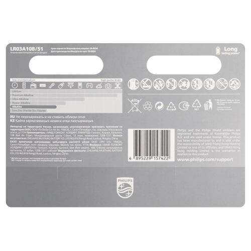 Щелочная технология для устройств с высоким энергопотреблением. Долговечные и надежные элементы питания для повседневных устройств, таких как часы и радиоприемники. Базовые щелочные батареи Philips обеспечивают максимальное качество для стандартных задач.