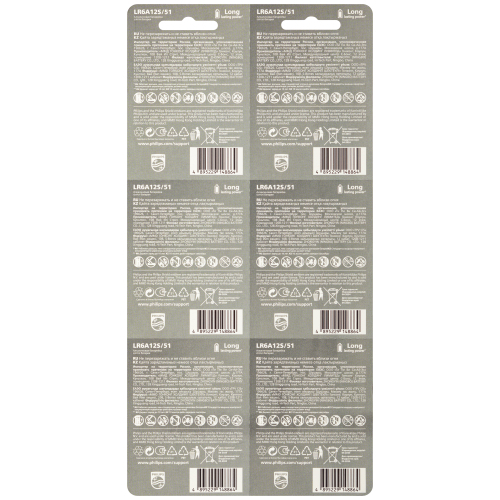 Алкалиновая (щелочная) батарейка типа AA LR6 / MN 1500 (пальчиковая) питает все устройства с высоким энергопотреблением. Долговечные и надежные элементы питания для повседневных устройств, таких как часы и радиоприемники. Базовые щелочные батареи Philips обеспечивают максимальное качество для стандартных задач. Щелочная технология отлично подходит для устройств с высоким энергопотреблением. Благодаря наличию разных моделей вы можете использовать эти батарейки для любых нужд. Батарея остается годной для использования в течение 10 лет. Щелочные батареи Philips содержат 0 % кадмия, ртути и свинца. Тип элемента питания: Тип AA / щелочная LR6. Напряжение батареи: 1,5 В. Химический состав: Щелочная. Тяжелые металлы: Не содержит кадмия, Не содержит ртути, Не содержит свинца. Упаковочный материал: Картон, ПЭТ. Тип упаковки: Блистер ПЭТ. Срок хранения: 10 лет. Взаимозаменяема с: AA, LR6, AM3, 15A, MN1500. Щелочная технология обеспечивает питание устройств с высоким энергопотреблением. Эти батареи Philips гарантированно не содержат вредных тяжелых металлов, таких как кадмий, ртуть и свинец. Для удовлетворения потребностей потребителя Philips предлагает комплексный портфель наиболее часто используемых батарей (AA, AAA, C, D, 9 В) в различных вариантах упаковки. Любая батарея разряжается, когда она не используется. Мы гарантируем, что эта батарея содержит, по крайней мере, 80 % своей первоначальной энергии до окончания срока годности.