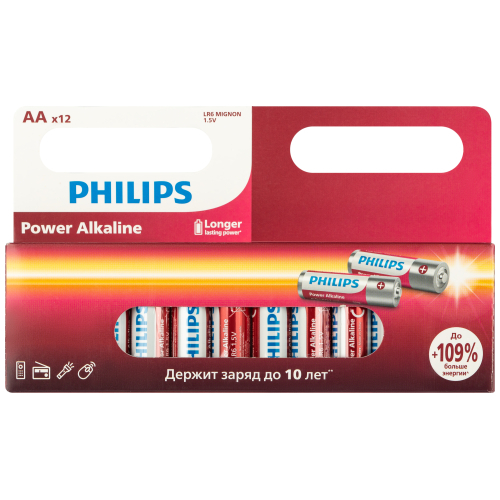 Продолжительное время работы энергоемких устройств. Современные электронные устройства, такие как электронные игрушки и портативные аудиоплееры, требуют все больше энергии. Для более долгой работы таких устройств используйте щелочные батареи Philips серии Power. Сохраняет заряд до 10 лет. Мощность на 109 % превышает отраслевые стандарты. Щелочная технология подходит для устройств с высоким энергопотреблением. Щелочные батареи в 6 раз лучше обычных батарей Цинк-карбон. Руководство по подбору подходящей батареи. Щелочные батареи Philips содержат 0 % кадмия, ртути и свинца. Тип элемента питания: Тип AA / щелочная LR6. Напряжение батареи: 1,5 В. Химический состав: Для щелочных батарей. Тяжелые металлы: Не содержит кадмия, Не содержит ртути, Не содержит свинца. Упаковочный материал: Картон, ПЭТ. Тип упаковки: Блистер ПЭТ. Срок хранения: 10 лет. Взаимозаменяема с: AA, LR6, AM3, 15A, MN1500. Щелочная технология обеспечивает питание устройств с высоким энергопотреблением. Эти батареи Philips гарантированно не содержат вредных тяжелых металлов, таких как кадмий, ртуть и свинец. Щелочные батареи в 6 раз лучше обычных батарей Цинк-карбон. Любая батарея разряжается, когда она не используется. Мы гарантируем, что эта батарея содержит, по крайней мере, 80 % своей первоначальной энергии до окончания срока годности. Мощность на 109 % превышает отраслевые стандарты
