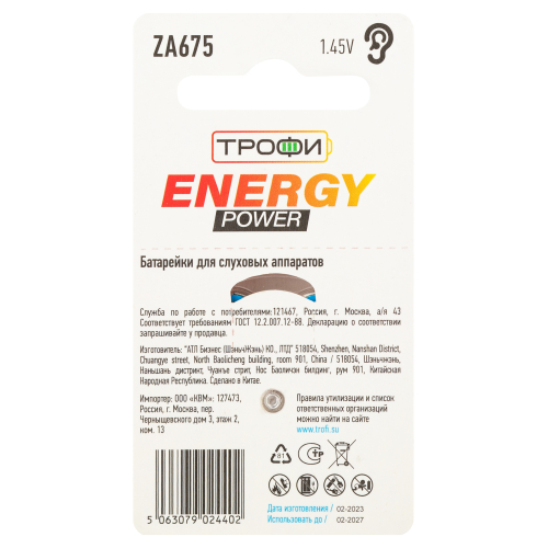 Батарейки Трофи ZA675-6BL воздушно-цинковые для слухового аппарата.
