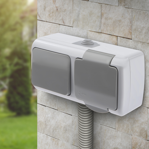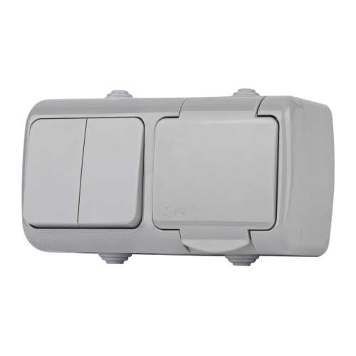 Блок розетка 2P+E + выключатель, 10(16)А-250В, ОУ, Atlantic, IP54, серый
