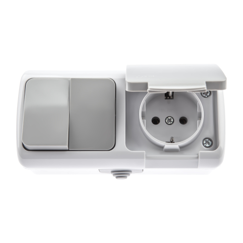 Блок розетка 2P+E + выключатель двойн., 10(16)А-250В, ОУ, Atlantic, IP54, серый