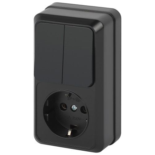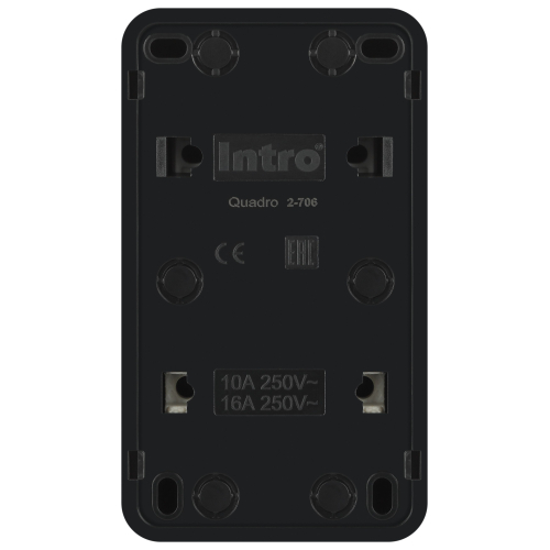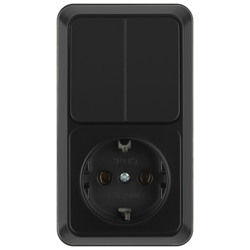 Блок розетка с выключателем вертикальный серии Intro Quadro открытой установки цвет антрацит 2-706-05. Номинальные характеристики 10(16)А-250В. Устройство выполнено из термопласта, керамики, стали и латуни, оснащено винтовыми зажимами.