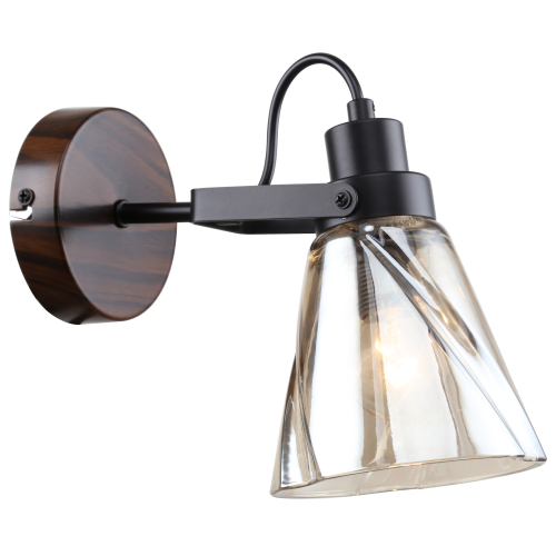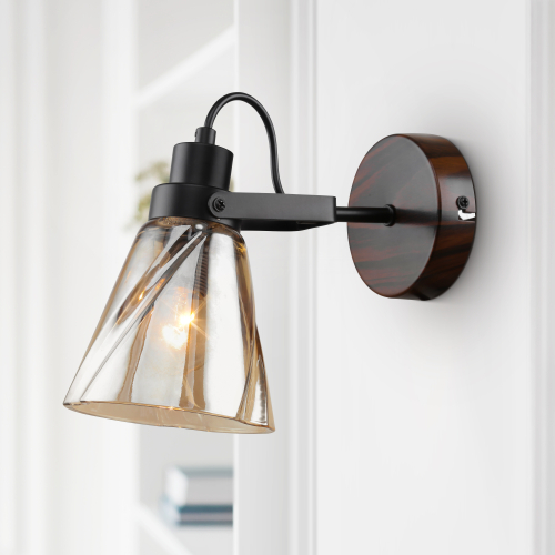 Настенное бра выполнено в стиле лофт-кантри. Металлический корпус бра окрашен гальваническим способом в чёрный цвет и тёмное дерево. Фигурный стеклянный плафон бра Clarissa на стену имеет тёплое тонирование, благодаря чему бра смягчает свет. Специальная конструкция этого бра настенного позволяет регулировать направление светового потока. Выполненные в тёмных цветах бра настенные дают возможность эффектно расставить в помещении акценты. Дополнительная дизайнерская «фишка» настенного светильника Rivoli Clarissa – декоративно выпущенный провод.