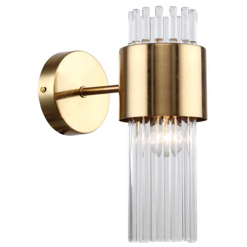 Бра настенное в цвете французское золото, с цилиндрическим плафоном из прозрачных стеклянных трубочек. Источник света для данного бра – лампа Е14 40 Вт (приобретается отдельно). Светильник настенный Rivoli Donna (арт. 3149-401) создаёт яркое дополнительное освещение. Размеры бра: 190*100*260 мм. К данному светильнику настенному можно купить люстры аналогичного дизайна: арт. 3149-305 – под 5 ламп, арт. 3149-307 – под 7 ламп. Коллекцию дополняет светильник подвесной – арт. 3149-201.