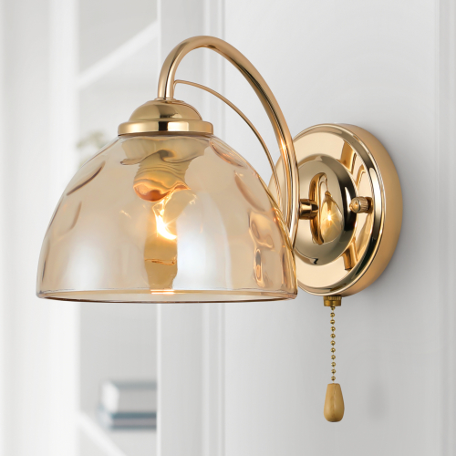 Бра золотого цвета, бра золотое, бра в спальню, бра в гостиную Rivoli Terri представляет дизайнерскую коллекцию итальянского бренда. Эффектный золотой цвет бра настенного достигается нанесением краски гальваническим способом. Такое покрытие защищает настенные светильники-бра от выцветания, царапин и сколов. Бра с выключателем удобно в применении как прикроватное бра, бра над кроватью, бра для чтения. Стеклянный тонированный корпус бра смягчает свет лампы. Дизайнерская находка этого бра на стену – красивый выдувной рисунок стекла плафона. Светильник-бра настенный Terri Rivoli применяется с источником света Е27 40 Вт.