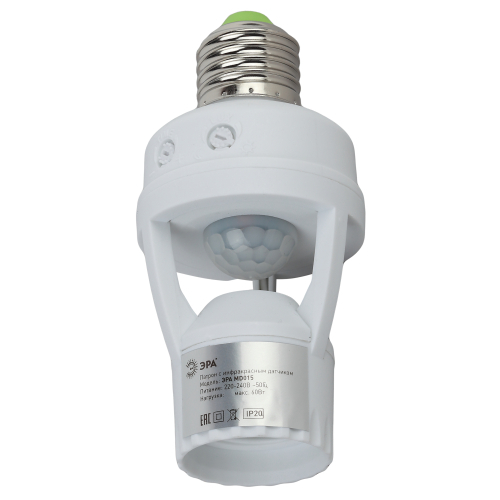 Простое устройство для экономии электроэнергии. В датчик-патрон вкручивается лампа с цоколем Е27, затем датчик с лампой вкручивается в стандартный патрон. Максимальное удобство в использовании и никаких дополнительных электромонтажных работ. Инфракрасный датчик-патрон MD15 от ЭРА имеет угол обзора 360 градусов и улавливает движение на расстоянии 6 метров. Вкрученная в него лампа автоматически включается, когда вы входите в помещение, и выключается, когда вы покидаете комнату. Больше не нужно подолгу нащупывать в темноте выключатель или ругать домочадцев за то, что забыли выключить свет. Датчик-патрон ЭРА сделает всё за вас! Инфракрасный датчик - самый распространённый и безопасный тип датчиков. Он улавливает инфракрасные волны, свойственные всем теплокровным существам: человеку или животным. Свет в помещении будет только в те минуты, когда вам это нужно. Так можно сэкономить до 80% электроэнергии.