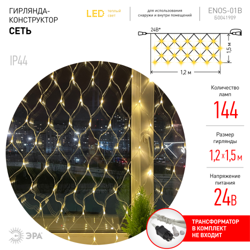 Праздничная светодиодная гирлянда ЭРА "Сеть" (арт. Б0041909) для использования внутри и снаружи помещений. Защищена от влаги и пыли (IP44), морозостойка - можно использовать на улице в регионах с низкими температурами. Идеальное решение для украшения окон, имеет оптимальные размеры: 1,2 х 1,5 м. На полупрозрачных малозаметных проводах размещены 144 ярких экономичных светодиода с уютным тёплым светом. Стильная аккуратная гирлянда ЭРА "Сеть" создаёт позитивное настроение и незабываемую атмосферу в доме, офисе, общественном пространстве. Применяется для новогодней иллюминации, оформления праздников, дизайна фотозон. Ещё одно преимущество - специальный разъём для сопряжения с другими гирляндами. Такая модульная конструкция позволяет соединять в единую цепь до 4 гирлянд ЭРА "Сеть", формируя длинный световой ряд для максимально эффектной иллюминации. Современная светодиодная технология экономит до 90% электроэнергии. Гирлянда отвечает требованиям пожарной безопасности, работает от трансформатора. Трансформатор ЭРА, преобразующий входное напряжение 210-240 В в выходное 24 В: http://www.eraworld.ru/catalog/2647679 (арт. Б0041911).