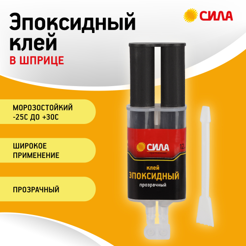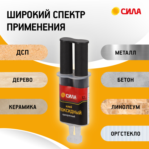 Эпоксидный клей СИЛА предназначен для соединения в различных сочетаниях металлов (железо, алюминий, медь, цинк), дерева, ДСП, бетона, керамики, линолеума, оргстекла и других материалов. Может применяться для заполнения мелких трещин, сколов и других объёмных повреждений, так как обладает хорошей текучестью и быстрым затвердеванием (время кристаллизации смеси - не более 3 минут).
