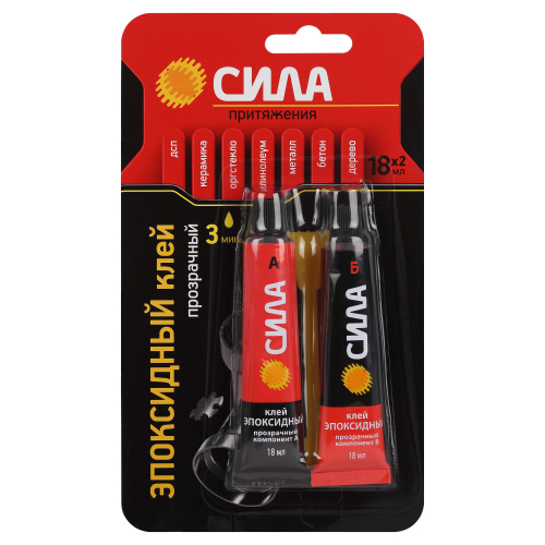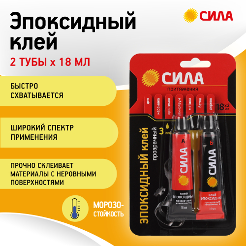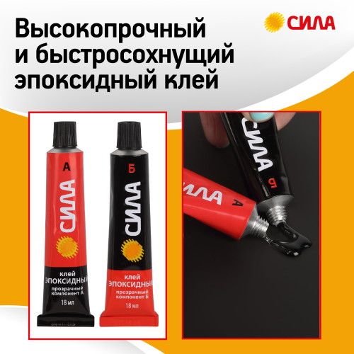 Эпоксидный клей СИЛА предназначен для соединения в различных сочетаниях металлов (железо, алюминий, медь, цинк), дерева, ДСП, бетона, керамики, линолеума, оргстекла и других материалов. Может применяться для заполнения мелких трещин, сколов и других объёмных повреждений, так как обладает хорошей текучестью и быстрым затвердеванием (время кристаллизации смеси - не более 3 минут).