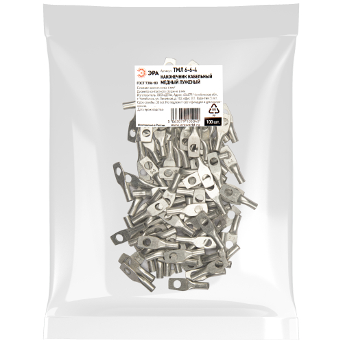 Наконечник кабельный медный луженый ЭРА ТМЛ 6-6-4 используется для оконцевания проводов и кабелей с медными жилами сечением до 6 мм² и применяется для кабелей напряжением до 35 кВ.