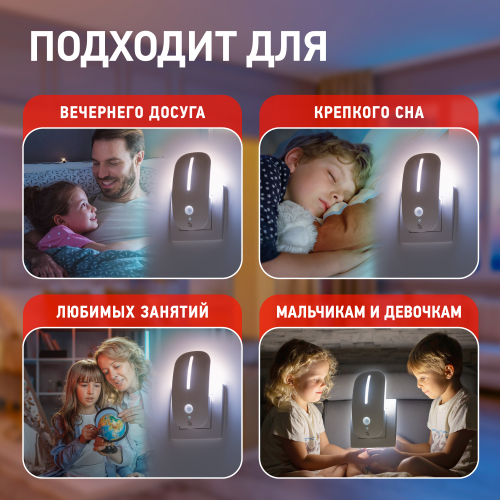 Светильник-ночник со светодиодами (LED) в качестве источников света. Удобная и функциональная модель с сенсором света и датчиком движения (включается автоматически от движения в зоне действия датчика движения, только когда темно. Светодиодный ночник не мерцает, что помогает сохранить здоровье глаз. Минимальное потребление энергии позволяет использовать прибор всю ночь.