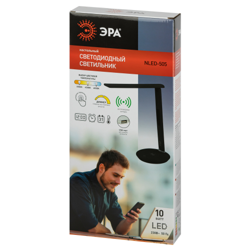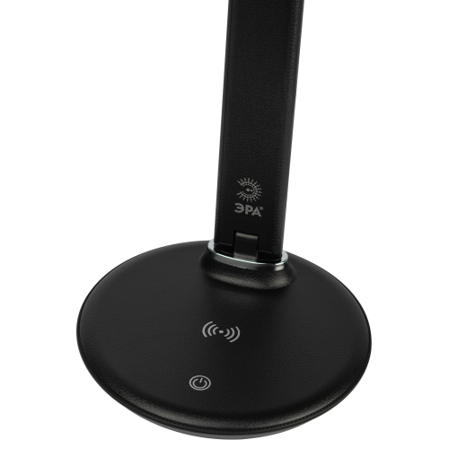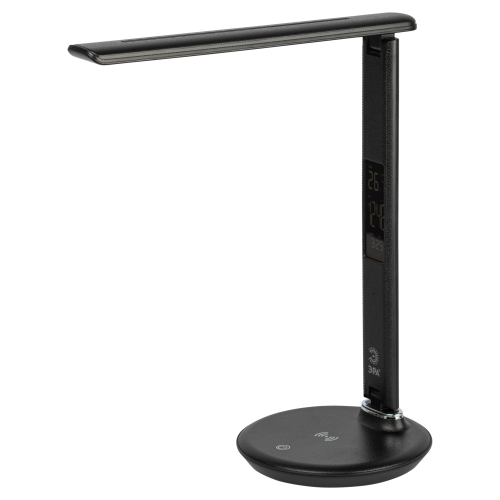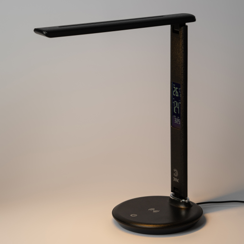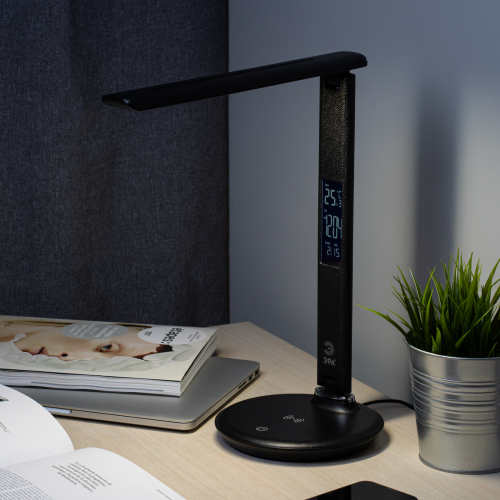 Премиальный складной настольный светильник ЭРА NLED-505 оснащен USB портом и модулем Qi для беспроводной зарядки мобильных устройств, а также ЖК дисплеем с функциями часов, будильника, календаря и термометра. Сенсорное управление обеспечивает выбор цветовой температуры света и плавную регулировку яркости. Поверхность светильника тактильно приятной фактуры под кожу. Направление света регулируется за счет наклона стойки и плафона до 180°.