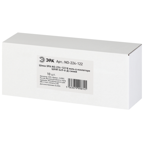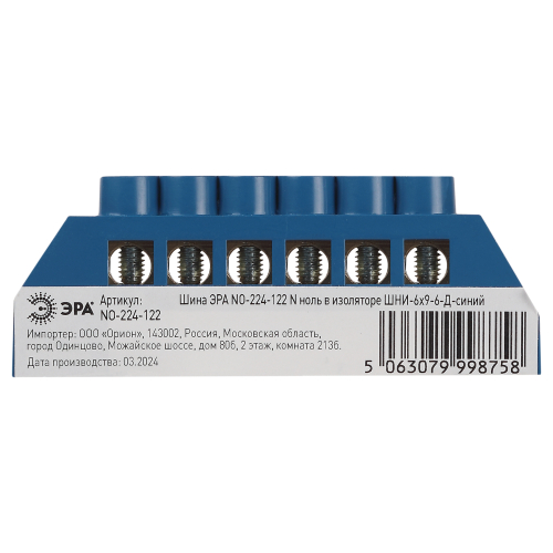 Изделие выполнено из латунной шины сечением 6×9 мм установленной в пластиковый изолятор синего цвета.