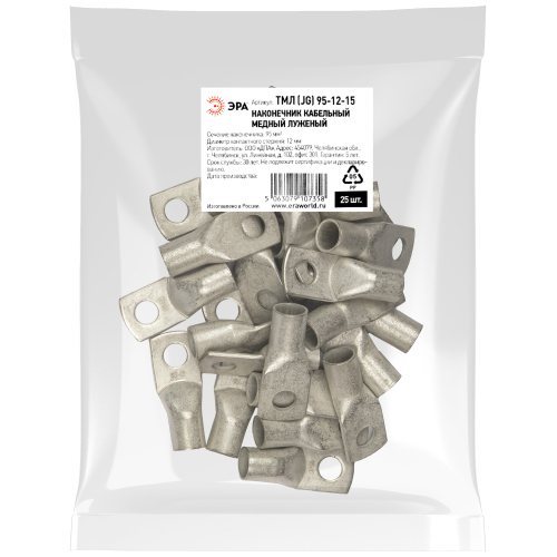 Наконечник кабельный медный луженый ЭРА ТМЛ (JG) 95-12-15 используется для оконцевания проводов и кабелей с медными жилами сечением до 95 мм² и применяется для кабелей напряжением до 10 кВ.