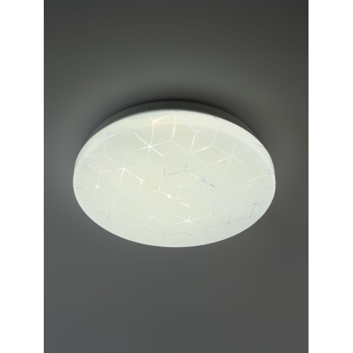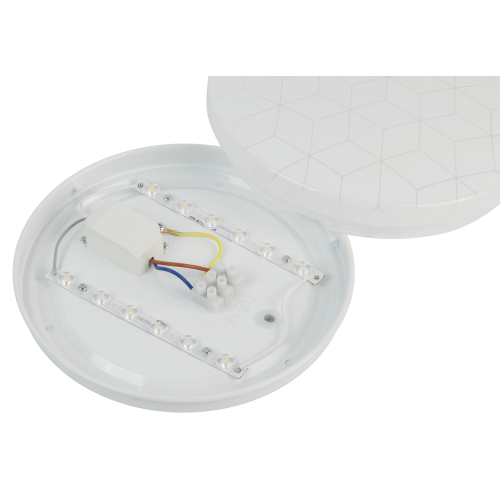 Компактные размеры 210×50 мм позволяют устанавливать светильник даже в помещениях с низкими потолками. Степень защиты IP20 делает его идеальным для сухих интерьеров. Геометрический узор на плафоне мягко подсвечивается при включении, создавая лёгкий декоративный эффект.