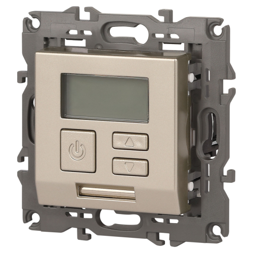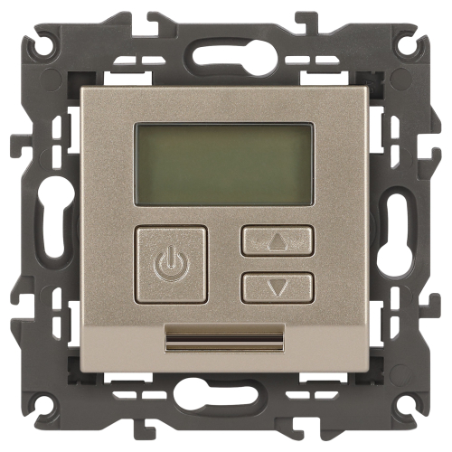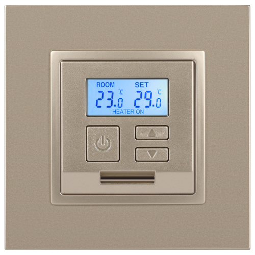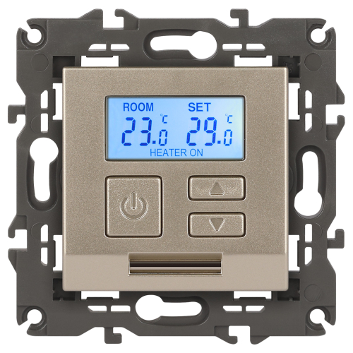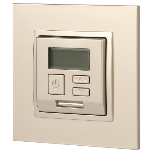 Терморегулятор теплый пол / отопление электронный серии Эра Elegance цвет шампань 14-4111-04. Рамки приобретаются отдельно. Рамки Эра Elegance ПЛАСТИК: 1 пост 14-5001-хх, 2 поста 14-5002-хх, 3 поста 14-5003-хх, 4 поста 14-5004-хх, 5 постов 14-5005-хх; СТЕКЛО: 1 пост 14-5101-хх, 2 поста 14-5102-хх, 3 поста 14-5103-хх, 4 поста 14-5104-хх; МЕТАЛЛ: 1 пост 14-5201-хх, 2 поста 14-5202-хх, 3 поста 14-5203-хх, 4 поста 14-5204-хх; ДЕРЕВО: 1 пост 14-5301-хх, 2 поста 14-5302-хх, 3 поста 14-5303-хх, 4 поста 14-5304-хх (хх - код цвета: 00-прозрачный, 01-белый, белёный дуб, 02-слоновая кость, 03-алюминий, 04-шампань, 05-чёрный, чёрное дерево, 07-ясень, 09-дуб, 10-венге, 11-клён, 14-медь, 21-жёлтый, 22-оранжевый, 23-красный, 25-бордо, 26-лайм, 27-зелёный, 28-голубой, 29-синий, 30-розовый, 31-мокко, 32-серый, 41-сталь, 42-титан).