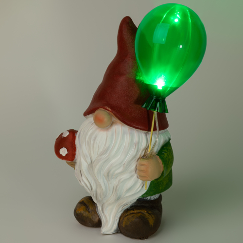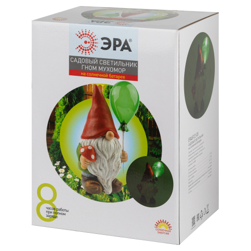 Фигурка садовая "Гном Мухомор" с шариком от компании ЭРА оживит пейзаж Вашего дачного участка! Этот уличный светодиодный светильник можно разместить в саду - в палисаднике, украсить беседку, веранду, кустарник, оригинально подсветить аллею или вход в дом. Садовый фонарь ERASF22-08 высотой 30 см выполнен из полистоуна и хорошо детализирован. Беспроводной светильник работает на солнечной батарее - этот тип получения энергии является самым экологичным, энергоемким, а также бесшумным. Питание происходит во включенном режиме в солнечную погоду, фигурка сама включается с наступлением ночи и работает до 8 часов. Зеленый шарик с подсветкой точно понравится и детям, и взрослым, и создаст неповторимую атмосферу праздника!