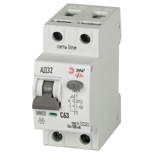 Автоматический выключатель дифференциального тока 6кА ЭРА АД-32 линейки Pro. АВДТ электронного типа. Профессиональные АВДТ ЭРА защищают человека от поражения электрическим током при повреждении изоляции электроустановок, предотвращают пожары вследствие токов утечки, предохраняют от перегрузки и короткого замыкания. Рекомендуются для защиты групповых линий, питающих розетки наружной установки, розеток и освещения подвалов и гаражей. Современное решение для квартирных щитков и промышленного применения.