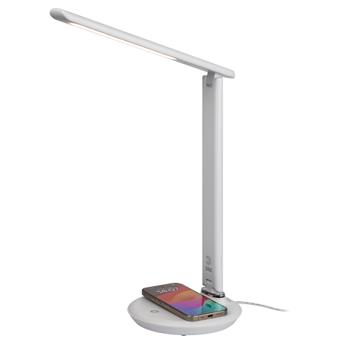 Настольный светильник со светодиодами (LED) в качестве источников света в дизайне под кожу . Выбор цветовой температуры - 3 цвета: 3000К, 4500К, 6000К. Сенсорный переключатель на основании. Плавный диммер для регулировки яркости. Встроенный USB порт для зарядки мобильных устройств, встроенный модуль Qi для беспроводной зарядки. Складная конструкция.