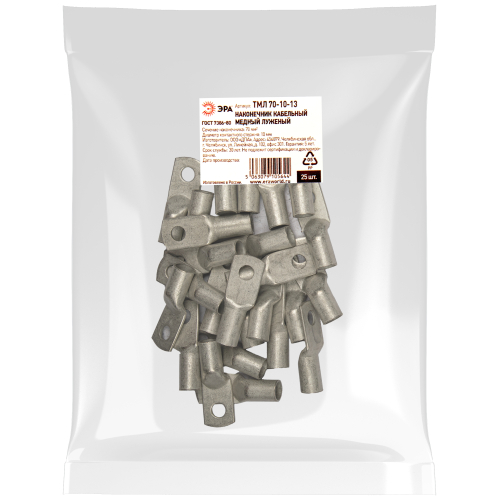 Наконечник кабельный медный луженый ЭРА ТМЛ 70-10-13 используется для оконцевания проводов и кабелей с медными жилами сечением до 95 мм² и применяется для кабелей напряжением до 35 кВ.