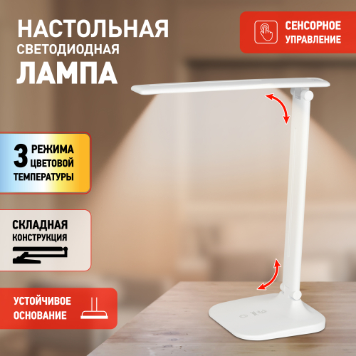 Настольный светильник со светодиодами (LED) в качестве источников света. Встроенный литиевый аккумулятор для автономной работы. Выбор цветовой температуры - 3 цвета: 3000К, 4500К, 6000К. Сенсорный переключатель на основании. Плавный диммер для регулировки яркости. Подзарядка от USB. USB кабель в комплекте. Складная конструкция.