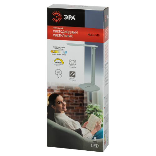 Настольный светильник ЭРА NLED-510-8W-W со светодиодами (LED) в качестве источников света. Встроенный литиевый аккумулятор для автономной работы. Подзарядка от USB. USB-кабель в комплекте. Оснащен сенсорным управлением с возможностью выбора цветовой температуры (теплый, нейтральный или холодный свет). Плавный диммер для регулировки яркости. Складная конструкция для оптимального хранения.