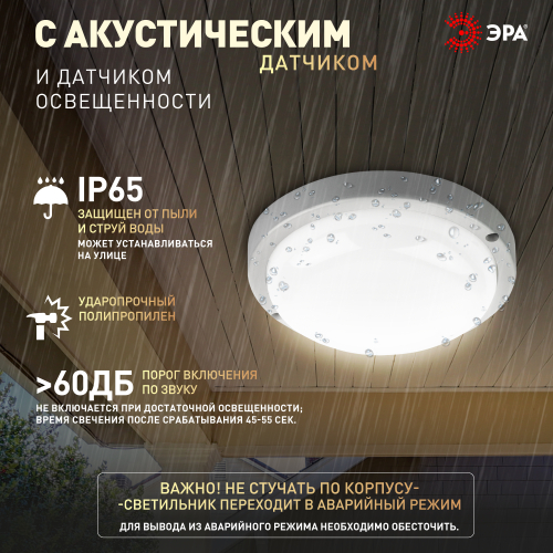 Пылевлагозащищённый LED-светильник IP65 круглой формы. Оснащён оптико-акустическим датчиком движения. В случае отсутствия какого-либо движения, свет гаснет. Если время задержки, 20-25 секунд, еще не истекло и зафиксировано движение, тогда начинается новый отсчет. Светильники срабатывают на уровень освещенности. Порог срабатывания