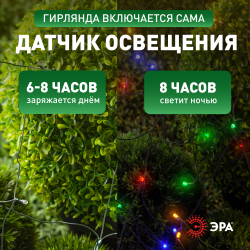Садовая гирлянда ERAUF024-16 мультиколор предназначена для подсветки растений, кустарников, аллей, фасадов и окон. Устройство также можно разместить и в квартире. Модель имеет стандартные внешние параметры 2х1,35 м. Уличная led подсветка работает на солнечной батарее. Такой тип получения энергии является наиболее экологичным, энергоемким, а также бесшумным. Питание происходит во включенном режиме, днем. Самое интересное начинается после захода солнца. 150 крохотных светодиодов хаотично загораются красными, зелеными, синими и желтыми цветами. Под этой красочной гирляндой захочется остаться подольше и наслаждаться праздничной атмосферой! Солнечная батарея предусматривает 8 часов непрерывной работы. Высокая степень защиты от пыли и влаги позволяет оставлять садовый светильник на улице во время дождя и при других неприятных погодных условиях. Обращаем Ваше внимание, что перед использованием фигурки её необходимо включить и зарядить. Светильник заряжается в течение всего светового дня. Декоративный светильник на солнечной батарее от бренда ЭРА прекрасный вариант для украшения Вашего дачного участка.