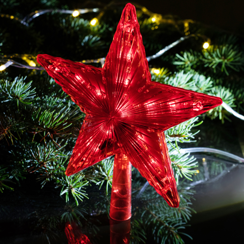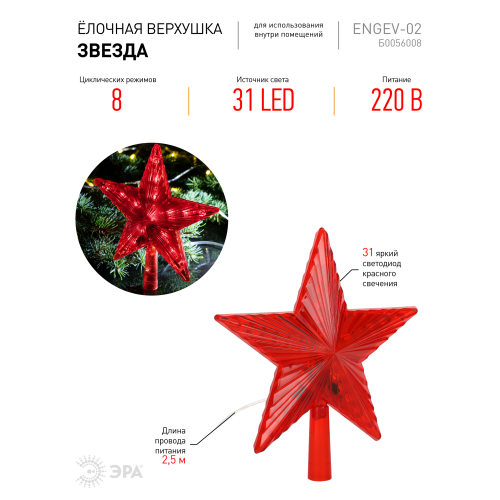 Светодиодная елочная верхушка ЭРА ENGEV-02 "Звезда" (арт. Б0056008) красного цвета, высота 21 см, подключается к стандартной электросети 220V. Новый взгляд от компании ЭРА на классическую советскую звезду, украшавшую елки во многих домах огромной страны. Современный вариант традиционной елочной верхушки ЭРА ENGEV-02 начинен светодиодами и чередует режимы свечения. В пятиконечной звезде с удобным креплением на елку располагается 31 яркий LED источник света последнего поколения. Светодиодная елочная звезда от ЭРА экономит электроэнергию, выглядит лаконично, подходит для праздничной ели в разных стилях - ретро, советский, минимализм, эклектика. Доступны 8 циклических режимов свечения. Длина провода - 2,5 метра. Макушка на елку ЭРА ENGEV-02 предназначена для использования внутри помещений. Верхушка "Звезда" эффектно светится в темноте ярким красным светом и отлично дополняет новогодние украшения, елочные игрушки, новогодний декор.