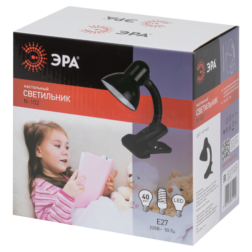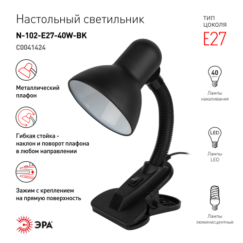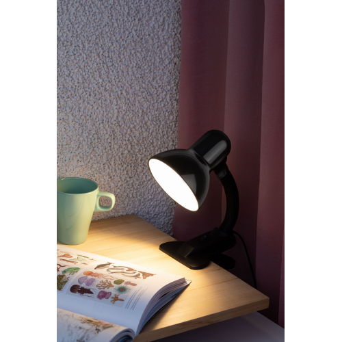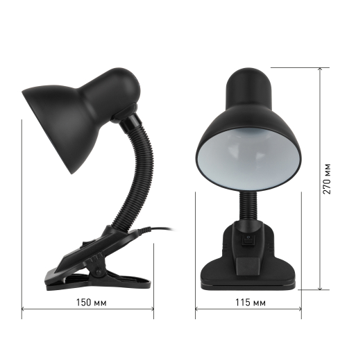 Светильник может использоваться с лампой накаливания, компактной люминесцентной лампой (КЛЛ) или светодиодной (LED) лампой. Прочная прищепка. Металлический плафон. Наклон и поворот плафона в любом направлении.