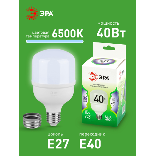 Светодиодная лампа ЭРА LED POWER T80-40W-865-E27/E40 GL серии Green Line — универсальный и энергоэффективный источник света. В комплекте предусмотрен сменный цоколь Е40, что позволяет использовать лампочку в различных помещениях. Цветовая температура 6500К излучает холодный белый свет без мерцаний. Высота лампы: 140 мм. Плафон в форме колокола обеспечивает равномерное распределение света. Лампочка ЭРА Е27 отличается низким энергопотреблением, долгим сроком службы и устойчивостью к перепадам напряжения. Работает от сети 220 В, эквивалентна 400 Вт лампе накаливания. Подходит для освещения жилых помещений, офисов, магазинов и производственных площадей.