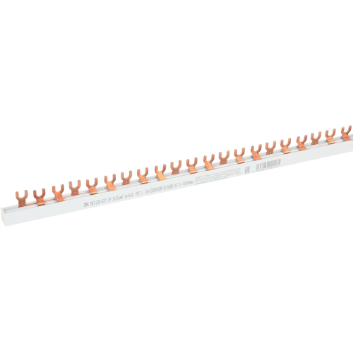 Шины соединительные представляют собой пластины, выполненные из меди, закрепленные в корпусе из диэлектрического материала, не поддерживающего горение, и выпускаются стандартной длиной 1 метр. Шины соединительные делятся на два типа - FORK («вилка») и PIN («гребенка») на номинальные токи 63 и 100 А. Могут быть выполнены в одно- двух- трех- и четырехполюсном исполнений.