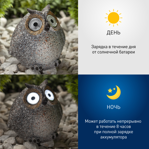 Садовый светильник на солнечной батарее ERAFYS01-08 "Сова" станет прекрасным украшением вашего сада. Небольшие размеры позволят Вам разместить дачную подсветку в палисаднике, украсить пруд, веранду, изящно подсветить аллею или вход в дом. Фигурка из полистоуна высотой 11,5 см с легкостью устанавливается в землю. Садовый светильник функционирует на солнечной батарее. Такой тип получения энергии является наиболее экологичным, энергоемким, а также бесшумным. Питание происходит во включенном режиме, в светлое время суток. После захода солнца маленькая сова "просыпается". Территория вокруг нее освещается холодным белым светом, исходящим из глаз. Создается настоящая атмосфера волшебства. Необычный стиль корпуса придает фигурке причудливый стиль. Солнечная батарея предусматривает 8 часов непрерывной работы. Высокая степень защиты от пыли и влаги позволяет оставлять садовый светильник на улице даже во время дождя. Обращаем Ваше внимание, что перед использованием фигурки её необходимо включить и зарядить. Светильник заряжается в течение всего светового дня. Подсветка на солнечной батарее ERAFYS01-08 "Сова" от компании ЭРА лучший вариант для преображения Вашей дачной территории.