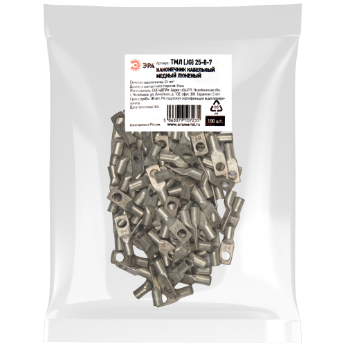Наконечник кабельный медный луженый ЭРА ТМЛ (JG) 25-8-7 используется для оконцевания проводов и кабелей с медными жилами сечением до 25 мм² и применяется для кабелей напряжением до 10 кВ.