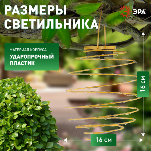 Подвесной уличный светильник для сада ERASF024-28 "Спираль" необычно стилизует любой участок. Небольшие внешние размеры позволят Вам расположить подсветку в саду, подвесить на дерево или кустарник, изящно подсветить тропинку, вход в террасу, дом или фасад. Конструкция из пластика высотой 16 см имеет простое крепление. Садовый светильник работает на солнечной батарее. Такой способ получения энергии является самым экологичным, энергоемким и бесшумным. Питание происходит во включенном режиме, в светлое время суток. После захода солнца спираль начинает светиться теплым желтым светом. Необычный дизайн и отделка желтым цветом придают устройству динамики, что создаст праздничную обстановку. Работа от солнечной батареи рассчитана на 8 часов непрерывной работы. ПВХ в составе светильника обеспечивает высокую степень защиты от пыли и влаги, а также устойчивость к механическим повреждениям. Это позволяет оставлять подсветку на улице в дождливую погоду. Обращаем Ваше внимание, что перед использованием фигурки её необходимо включить и зарядить. Светильник заряжается в течение всего светового дня. Уличный подвесной светильник "Спираль" от компании ЭРА прекрасный вариант для создания веселого настроения на дачном участке.