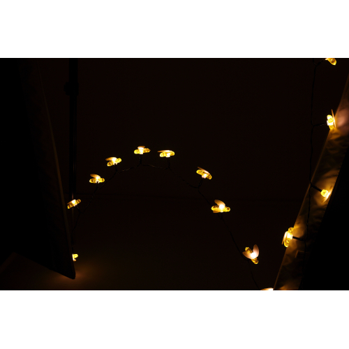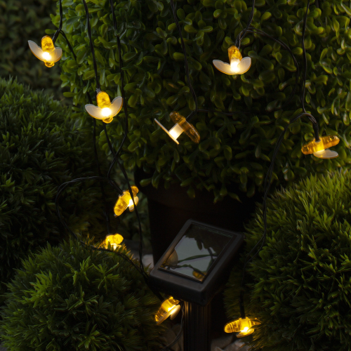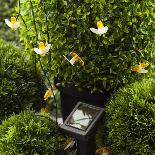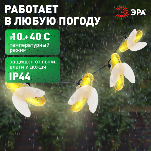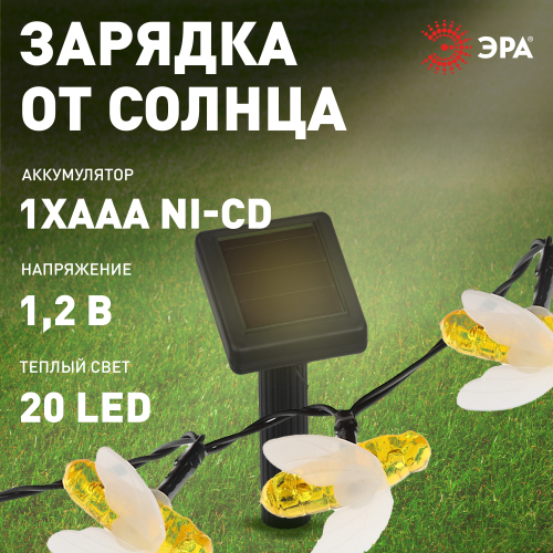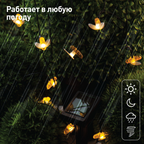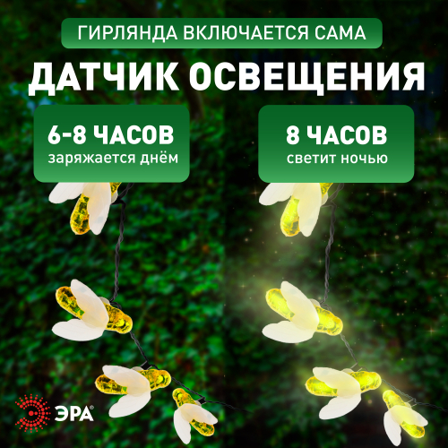 Уличная светодиодная гирлянда ERASG024-03 "Пчелки" станет ярким акцентом на Вашей дачной территории. Удобная конструкция и простая установка позволят Вам расположить гирлянду среди клумб, цветов и кустарников, красочно подсветить аллею, фасад здания или окно. Общая длина 5,8 м. Подсветка работает от солнечной батареи. Такой способ получения энергии является наиболее экологичным и энергоемким. Питание происходит во включенном режиме "ON". С наступлением темноты маленькие пчелки загораются. Их животики заливаются желтым светом, создавая веселую атмосферу. Подсветка улицы может длиться непрерывно в течение 8 часов. Высокая степень пыле и влагозащиты позволяет оставлять светильник на улице даже во время дождя. Обращаем Ваше внимание, что перед использованием фигурки её необходимо включить и зарядить. Светильник заряжается в течение всего светового дня. Создавайте уникальное вместе с гирляндой "Пчелки" на солнечной батарее от производителя ЭРА!
