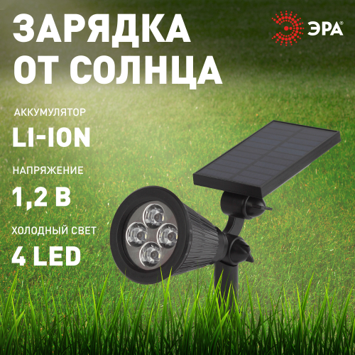 Уличный светодиодный светильник на солнечной батарее ERASP024-10 подходит для наружной ночной подсветки. Устройство станет прекрасным источником света Вашего дома, террасы, беседки, гаража. Это прекрасный выбор, чтобы подсветить приусадебный участок. Поворотные панели с эргономичными ручками позволяют регулировать направление света индивидуально. 4 LED диода будут заливать большую площадь объекта холодным белым светом. Функционирование на солнечной батарее является максимально экологичным, энергоемким, а также бесшумным. Питание происходит во включенном режиме, в дневное время. Высокая степень защиты от пыли и влаги позволяет оставлять светильник на улице даже во время дождя. Корпус из ударопрочного пластика устойчив к повреждениям и не требует особого ухода. Обращаем Ваше внимание, что перед использованием фигурки её необходимо включить и зарядить. Светильник заряжается в течение всего светового дня. Освещайте пространство выгодно и практично вместе с беспроводным LED светильником от компании ЭРА!