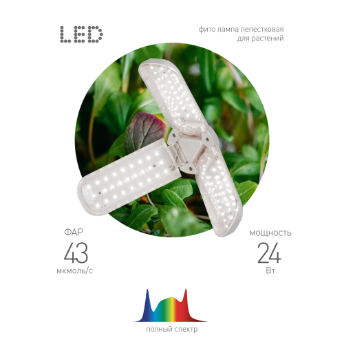 Эта удобная бытовая фитолампа-трансформер полного спектра по своей мощности и эффективности не уступает профессиональному фитопрожектору. Обеспечивает качественную досветку 2 кв м рассады. Мягкий белый свет комфортен для глаз человека. Поворотные лепестки позволяют быстро и без усилий изменить направление и интенсивность освещения конкретных растений. Эффектный внешний вид и максимальный комфорт в применении. На каждом лепестке по 27 светодиодов. Каждый лепесток поворачивается на 180 градусов. Индивидуальное регулирование наклона и направления светодиодных лепестков даёт возможность создать множество уникальных сценариев подсветки растений.