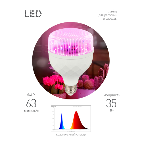 Мощная фитолампа красно-синего спектра — надёжный помощник в выращивании рассады, комнатных цветов, зелени и пасленовых. Создаёт комфортные условия для роста и развития растений, стимулируя набор питательных веществ и рост листьев. Мощность — 35 Вт. Цоколь — Е27. Рекомендуемое расстояние до листьев — 30–60 см. Время освещения — 8–14 часов, с темновой фазой 7 часов. Лампа излучает сбалансированный свет с соотношением синего и красного спектров 1:3, что способствует укреплению стеблей и росту плотных листьев. Использование прозрачного поликарбонатного рассеивателя повышает эффективность светового потока.
