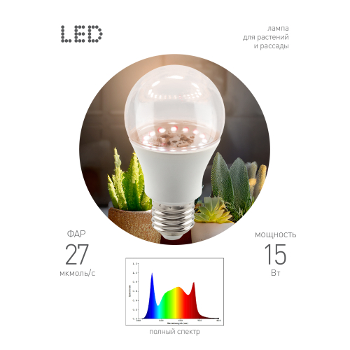 Лампа для выращивания растений ФИТО А60-15W-PFR-E27-GR, полного спектр