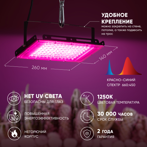 Светодиоды красно-синего спектра работают на малых токах, есть драйвер постоянного тока. Корпус из специального сплава алюминия быстро отводит тепло от светодиодов. Фитопрожектор будет работать бесперебойно и прослужит долго. Красно-синий спектр отлично моделирует солнечный свет. Рекомендуемое расстояние от листьев растений до прожектора: 20-50 см. Длина шнура — 120 см, евровилка.
