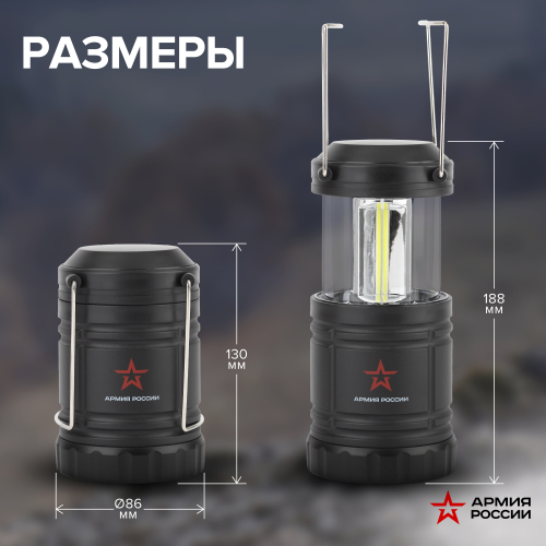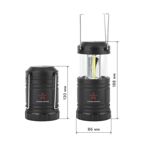 ЭРА Армия России ЗАРЯ - кемпинговый светодиодный фонарь-трансформер, изготовленный из экологичного и сверхлёгкого пластика. Три в одном: 1. универсальный фонарь с ручками - удобно освещать дорогу; 2. устойчивый светильник, который можно поставить на столе для получения света и создания уютной атмосферы на привале; 3. светильник по типу уличного фонаря - подвешивается к разным типам поверхностей при помощи магнита или крючка.Светодиодная часть за считанные секунды "прячется" в корпус. Это защищает осветительные элементы от ударов и экономит место в рюкзаке. Яркий и плотный свет обеспечивают светодиоды СОВ ("мультикристалл на плате"). Технология, широко применяемая в промышленном освещении, теперь адаптирована для универсальных целей. ЭРА получила уникальный по качеству свет, который при своей повышенной яркости является комфортным для глаз. Дальность освещения - 13 метров, а одного заряда аккумулятора будет достаточно в тёмное время суток - 9 часов непрерывной работы. Простой доступный формат питания фонаря - 3 пальчиковые батарейки. Серия фонарей ЭРА Армия России - совместный проект отечественного бренда ЭРА и АО "Военторг", действующего на основании лицензии Министерства обороны РФ.