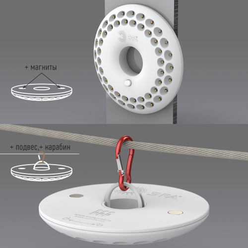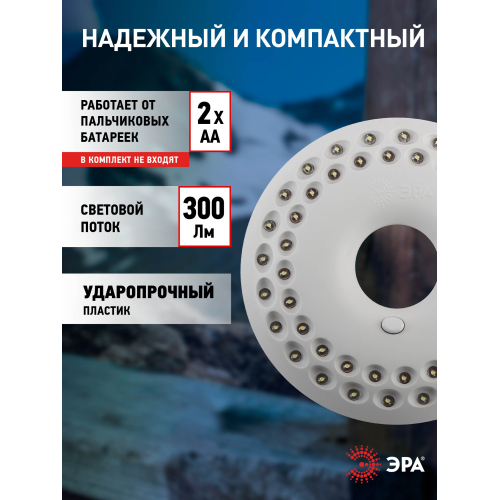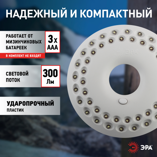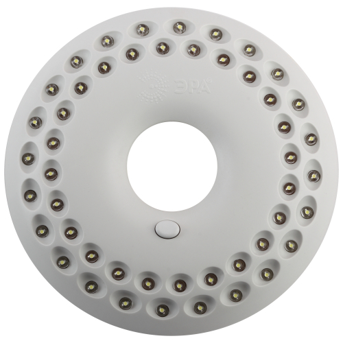 Фонарь собственного дизайна ЭРА, ставший одной из самых популярных туристических моделей. Производится в России. Получил название "НЛО" за круглую форму корпуса и футуристический внешний вид. 48 светодиодов эргономично расположены на корпусе по кругу, они не перегорают, не требуют замены, разумно расходуют заряд и дают яркое освещение. Особое преимущество и настоящая "фишка" ЭРА НЛО-48 - в секретах эксплуатации. Фонарь закрепляется при помощи специального кронштейна (подвес + карабин), превращаясь в яркую походную "люстру". Для металлических поверхностей в тыльную сторону корпуса вмонтированы магниты. Но самый простой способ использования - закрепить на горлышке бутылки. Тогда это уже импровизированный настольный светильник. Надёжный помощник в походе, на охоте, рыбалке, загородном отдыхе. Набирают популярность и нестандартные способы применения ЭРА НЛО-48 - его используют как бюджетный вариант кольцевой подсветки при портретных фотосъёмках. Корпус ЭРА НЛО-48 стал отражением современных bio-тенденций