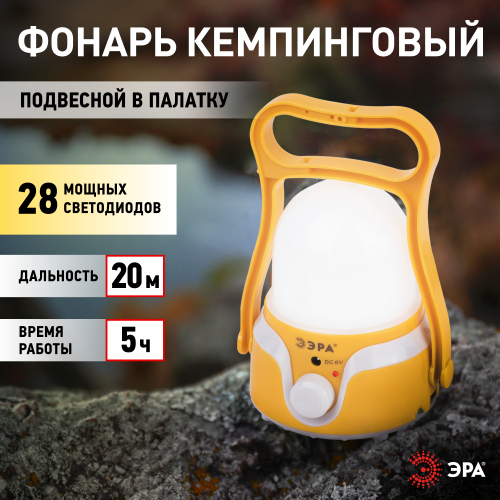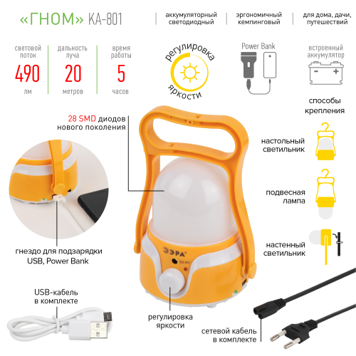 ЭРА КА-801 "Гном" - эргономичный кемпинговый LED-фонарь с удобной ручкой и диммированием яркости. Работает от встроенного аккумулятора, подзаряжается от USB-кабеля, поставляемого в комплекте. Качественное ровное освещение создают 28 светодиодов нового поколения. С помощью диммера на корпусе яркость света регулируется плавно, что очень комфортно для глаз. Круглый плафон формирует объемное заливающее освещение. Благодаря специальной поворотной ручке кемпинговый фонарь ЭРА "Гном" можно крепить разными способами и использовать как подвесную лампу, настенный светильник, настольный светильник. Выбор минимальной яркости дает возможность применять этот фонарь в качестве портативного ночника. При максимальной яркости световой поток равен 490 Лм. Одна полная подзарядка обеспечит вас 5 часами непрерывного свечения. Фонарь-светильник ЭРА КА-801 имеет приятный дизайн с плавными мягкими линиями и теплую цветовую гамму.