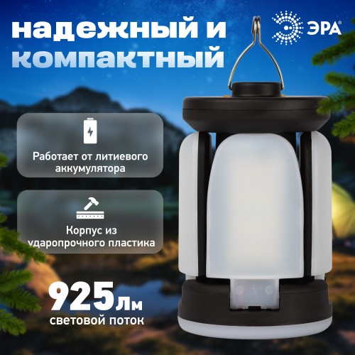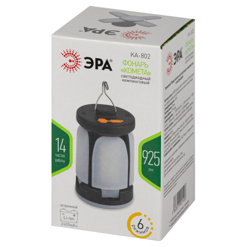 ЭРА КА-802 «Комета» - компактный и лёгкий фонарь-светильник линейки кемпинговых фонарей торговой марки ЭРА. Новый светодиодный фонарь имеет конструкцию трансформера и позволяет организовать полноценное походное освещение на привале. Угол наклона каждого из 4 светодиодных модулей можно регулировать, качественно подсвечивая определённые зоны пространства. В полураскрытом варианте, делающем LED-фонарь похожим на комету, ЭРА КА-802 формирует широкое заливающее освещение, в раскрытом – более направленную яркую подсветку. Вариант со сложенными светодиодными модулями – это уютный настольный светильник для кемпинга.